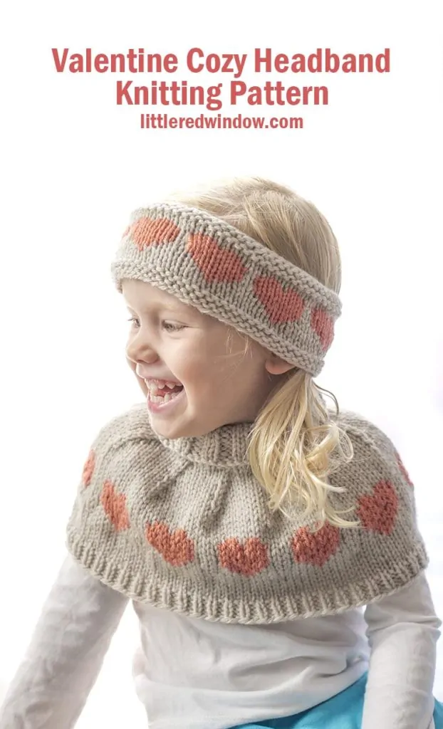 This adorable baby and toddler headband knitting pattern with a heart pattern is the companion pattern to the Valentine Cozy Cowl knitting pattern which is shown in all the pics. Knit one or both, they’re perfect for your little Valentine sweetheart!